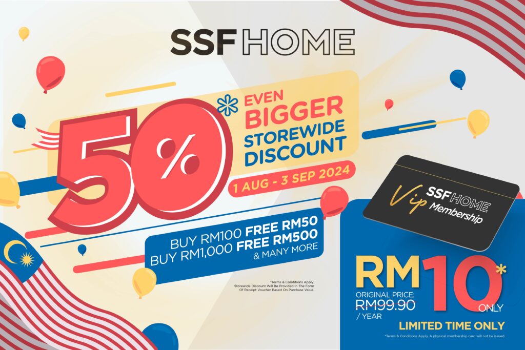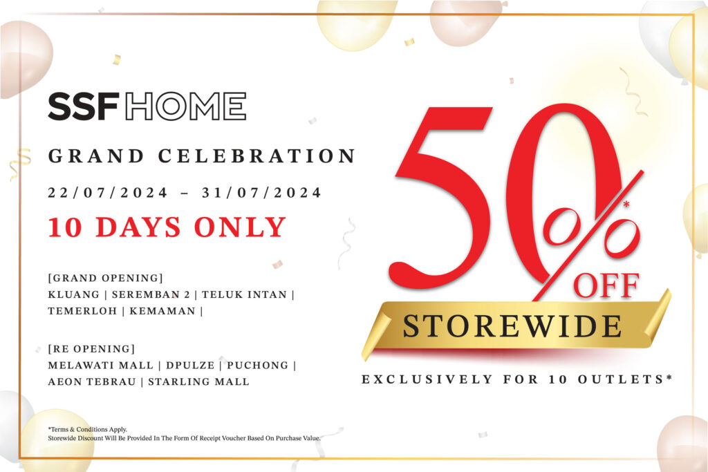 Join us for the SSFHOME Grand Celebration! SSFHOME VIP members can enjoy a storewide 50% discount when shopping at our specially selected 10 outlets across Malaysia. Shop till you drop and receive a 50% receipt voucher based on your total purchase. Don’t miss this opportunity to spruce up your home with our exclusive range of