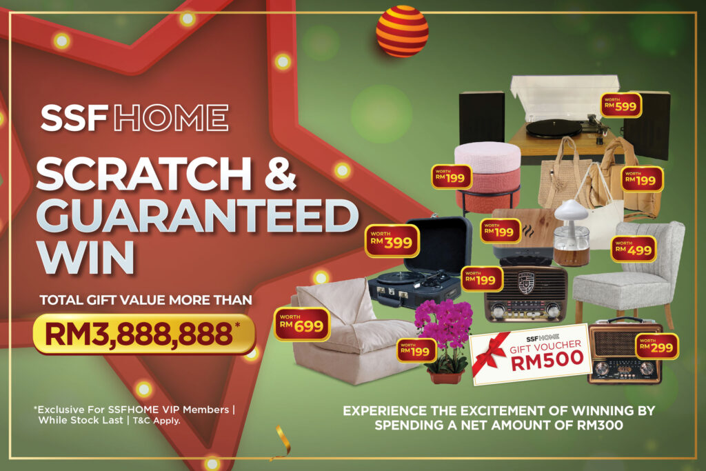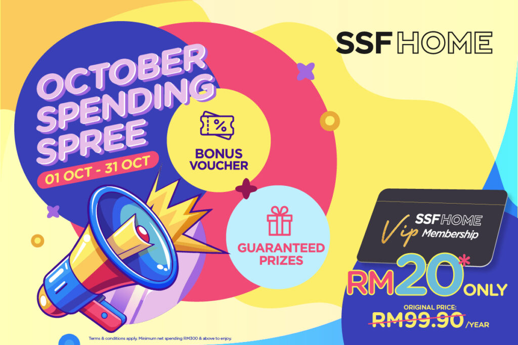 Get ready for the SSFHOME October Spending Spree! VIP Members, spend RM300 or more in a single transaction and unlock exciting rewards. You’ll receive a guaranteed prize through our Scratch & Win activity and a Bonus Voucher for future purchases. The more you spend, the greater the value of the rewards! Don’t miss this chance