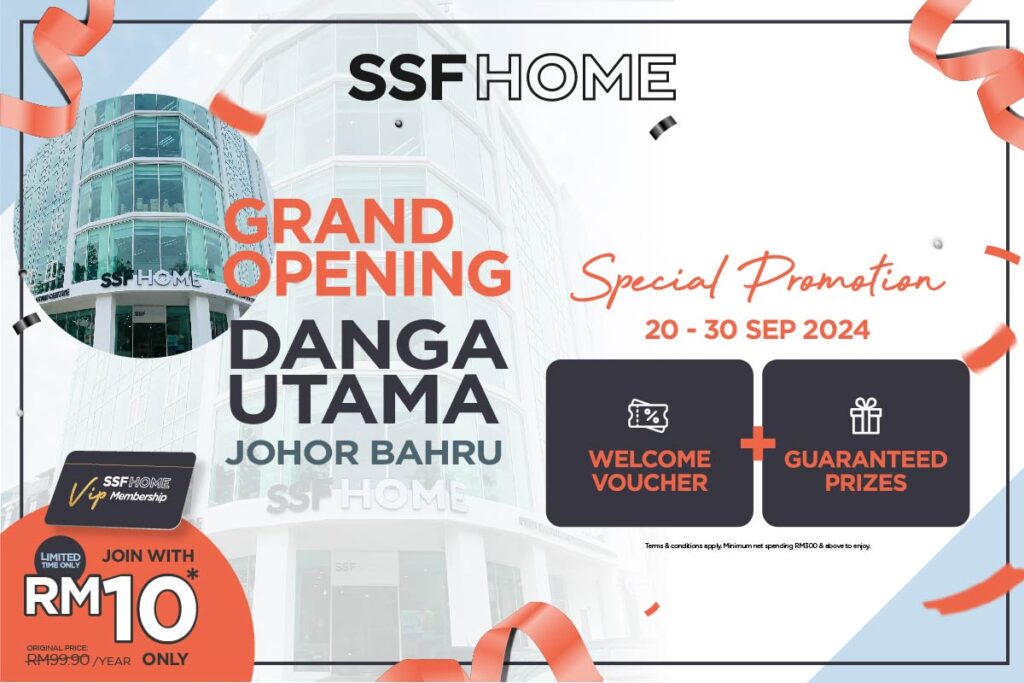 It’s the grand opening of SSFHOME Danga Utama! We are excited to unveil our newest location and invite you to celebrate with us. Join us on the 20th & 21st of September 2024 for a festive opening event filled with exclusive promotions and complimentary coffee. Event Highlights: Grand Opening Specials: With every net minimum spending