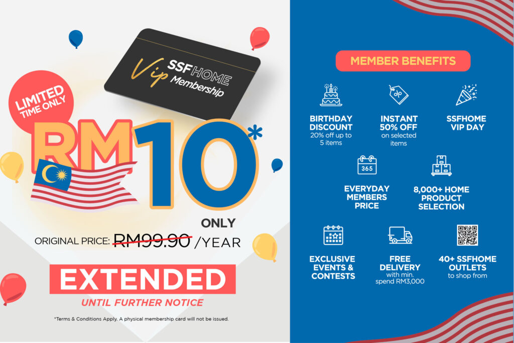 We are excited to share the news that the RM10 SSFHOME VIP Membership offer has been extended! You can take advantage of this exclusive opportunity to become a VIP member at a special rate for a limited time. Elevate your shopping experience and enjoy VIP privileges and benefits by upgrading to SSFHOME VIP Membership for