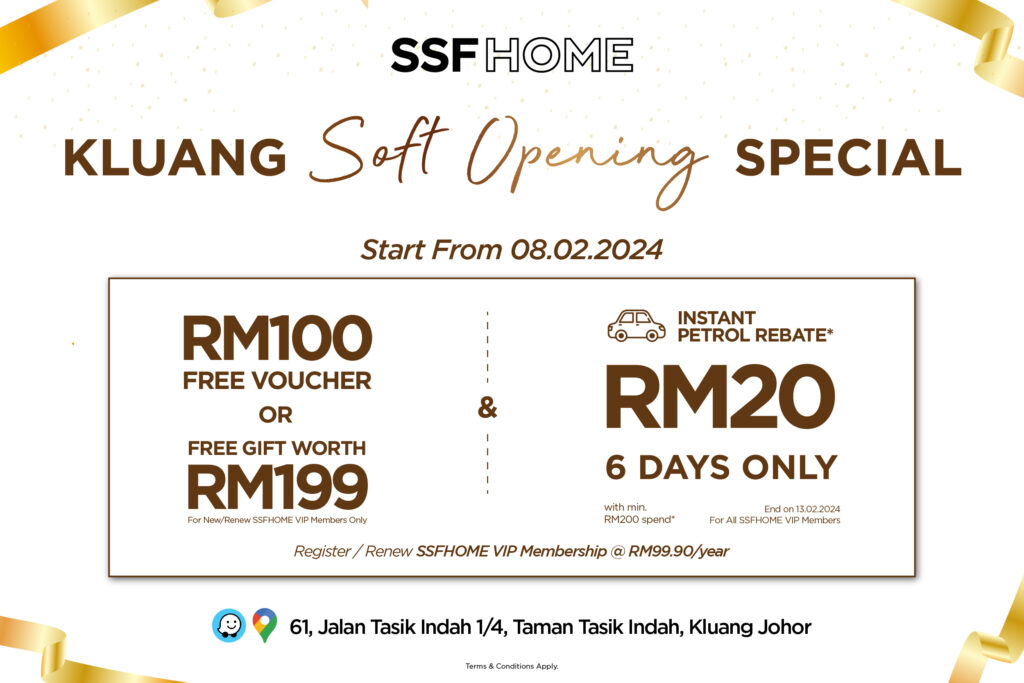 Welcome to SSFHOME Kluang, where home decor dreams come true! We are excited to invite all Kluangnites to our highly anticipated soft opening. Join us in celebrating the launch of our new outlet and indulge in exclusive promotions that will elevate your home decor experience. During our soft opening, Kluangnites can take advantage of special