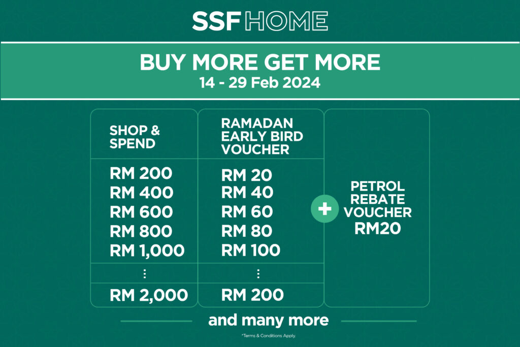 Experience the ultimate Ramadan shopping experience at SSFHOME! From 14/02/2024 until 29/02/2024, immerse yourself in our exclusive in-store promotion – the SSFHOME Ramadan Early Bird Special. Discover stunning products and take advantage of our buy more, save more method to enhance your Ramadan decor. Don’t miss out on this limited-time opportunity to transform your home